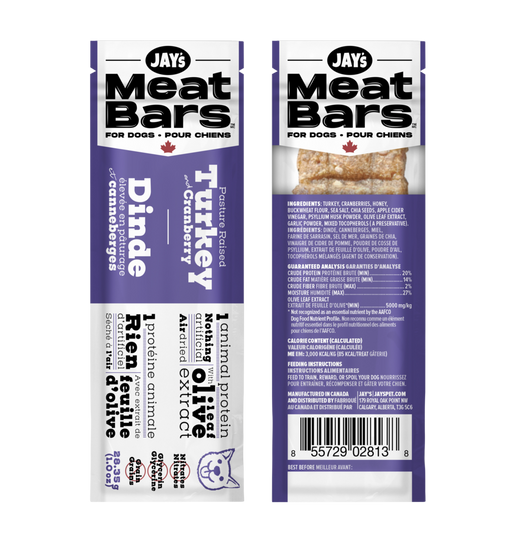 $3.29Jay's Meat Bars Turkey & Cranberry 28g A perfect travel treat for your dog. This 1 oz MEATBAR is loaded with turkey and combined with fresh cra...