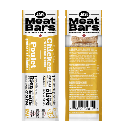 $3.29Jay's Meat Bars Chicken & Sesame Seeds 28g A perfect travel treat for your dog. This 1 oz MEATBAR is loaded with chicken and combined with ses...