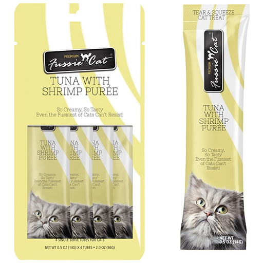 $3.99FC Treats Tuna w/ Shrimp Puree 2oz Fussie Cat Tuna with Shrimp Purée provides a high-quality source of protein and amino acids with real tuna as t...