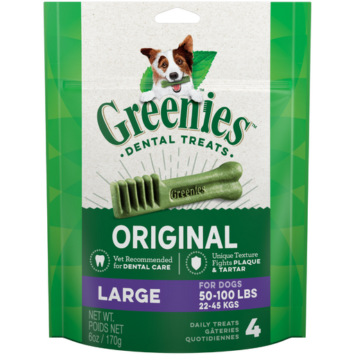$11.99Greenies Dental Treat 4/Large 6oz One GREENIES™ Original Dental Treat a day is all it takes for clean teeth, fresh breath and a happy dog. Your dog...