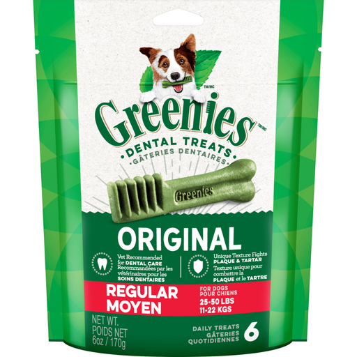 $11.99Greenies Dental Treat 6/Reg 6oz One GREENIES™ Original Dental Treat a day is all it takes for clean teeth, fresh breath and a happy dog. Your dog c...