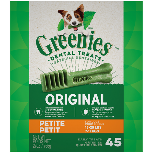 $45.99Greenies Dental Treat Petite 27oz, 45 One GREENIES™ Original Dental Treat a day is all it takes for clean teeth, fresh breath and a happy dog. Your...