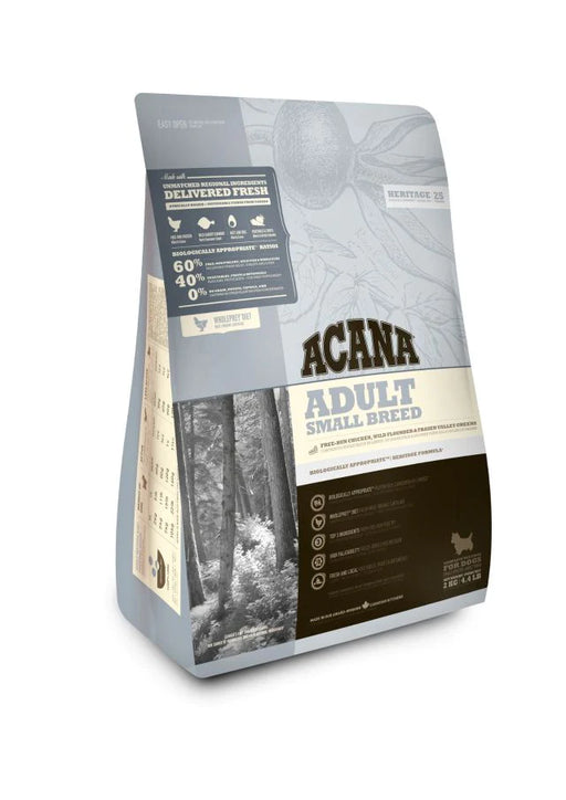 $29.99 to $59.99Size Options AvailableAcana Heritage Small Breed Adult Dog Even though they’re not big, small-breed dogs have the same nutritional requirements as their larger cousins....