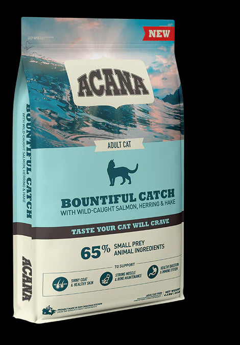 Feed your little wildcat a diet packed with whole fish ingredients. NEW ACANA Bountiful Catch is loaded with quality fish ingredients from wild-caught salmon & herring, and rainbow trout, in richly nourishing WholePrey ratios of fish, organs, and bone, so your cat is getting the nutrients they need, naturally.