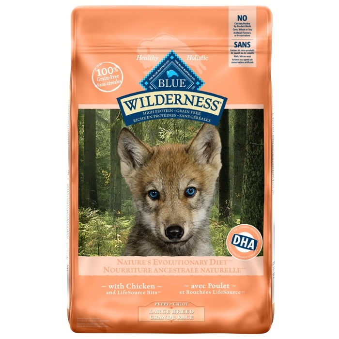 Satisfy the spirit of the wolf with meat-rich BLUE Wilderness. This protein-rich recipe contains more of the delicious deboned chicken your puppy loves, antioxidant-rich fruits and vegetables, plus DHA to support your large breed puppy's healthy growth and development.