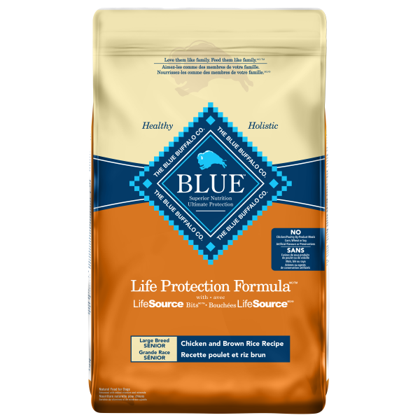 BLUE Life Protection Formula Chicken and Brown Rice Recipe for Large Breed Senior Dogs is made with only the finest natural ingredients such as delicious, protein-rich, deboned chicken and wholesome whole grains, garden veggies and fruit. Formulated for the health and well-being of senior dogs, it also includes glucosamine and chondroitin to promote healthy joints in large-breed dogs. BLUE Life Protection Formula contains NO chicken (or poultry) by-products, NO corn, wheat or soy and NO artificial flavors or preservatives.