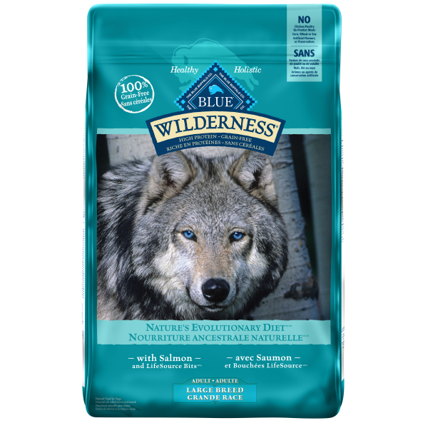 BLUE Wilderness Salmon Recipe for large breed adult dogs is a grain-free, protein-rich food that contains more of the delicious salmon your dog loves. Inspired by the diet of wolves, it's made with only the finest natural ingredients featuring deboned salmon, chicken meal and fish meal to supply the protein your dog needs.