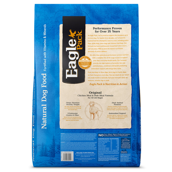 Eagle Pack Original Chicken Meal & Pork Meal Formula Dog Food is formulated to meet the nutritional levels established by the Association of American Feed Control Officials (AAFCO) Dog Food Nutrient Profiles for all life stages.