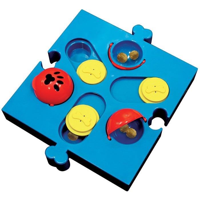 Puzzle your pup with a delightful, rewarding game using a unique treat dispenser by Ethical Pet. This plastic toy provides your dog with mental stimulation using multiple compartments and his favorite reward: treats! Your little Einstein must "flip and slide" each compartment to find the treasure hidden beneath. Watch as he uses his nose and paws to nudge the pockets, searching for a tasty snack, and clap when he finds his prize. It's an excellent task to stimulate his brain—preventing boredom and exercising his critical thinking skills. Connect multiple puzzles together for a bigger challenge!