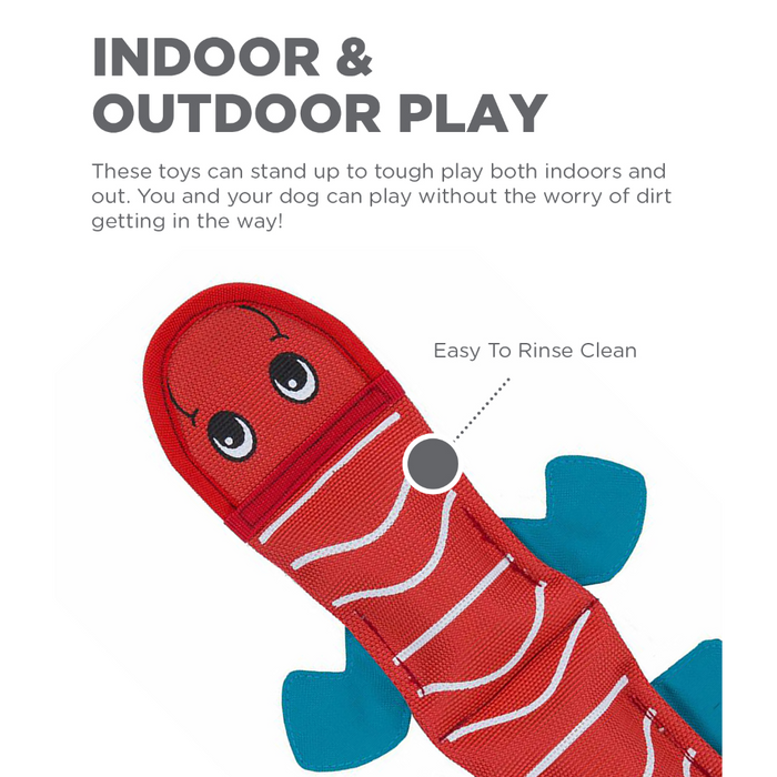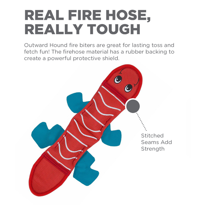 Treat your pup to long-lasting fun with Outward Hound Fire Biterz! Doggy destroyers have met their match with these tough, but lovable lizards. Constructed with real fire hose material, these toys are stuffing free and include Invincibles squeakers that keep squeaking if punctured! It all adds up to long-lasting fun for your furry friend!