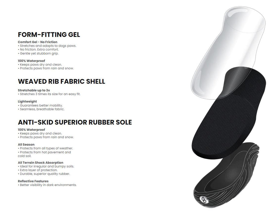 Our proprietary elastomer form-fitting gel technology guarantees a perfect fit, ultimate comfort, and a gentle but stubborn grip to provide dogs and owners with a seamless, hassle-free paw-wear experience.