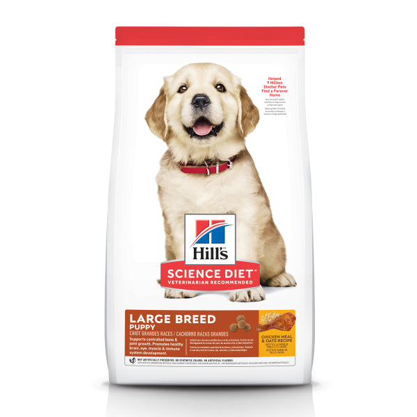Big dogs need lots of love, and Hill's Science Diet Large Breed Puppy dry food is specially made with a delicious chicken flavor and an optimal level of calcium for controlled bone growth - a unique developmental need of large breed puppies. Give your large dog his or her best start in life so they can grow to their full potential with balanced minerals that promote strong bones and strong teeth. This dog food made with natural ingredients uses DHA from fish oil to support your large dog's eye development and brain function. High-quality protein helps your large dog build and maintain muscle.