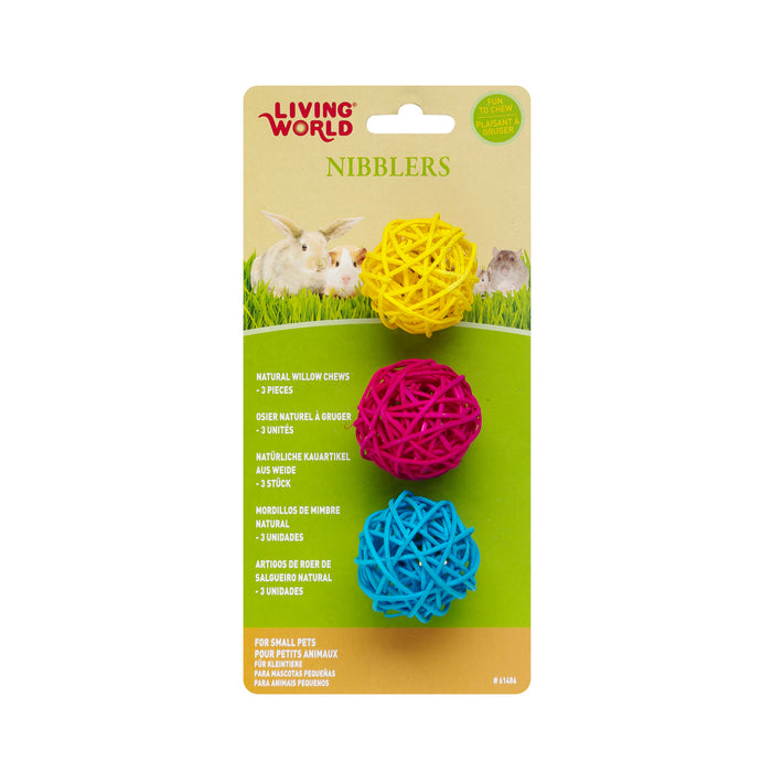 Living World Nibblers Willow Chew Balls contain 3 colourful ball-shaped willow chew balls.