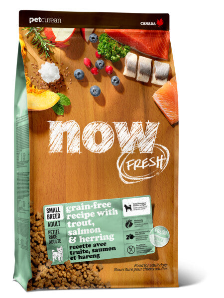 NOW FRESH™ Grain Free Small Breed Fish Adult Recipe is made with 100% FRESH trout, salmon, herring, and 100% fresh Omega 3 & 6 oils from coconuts and canola.