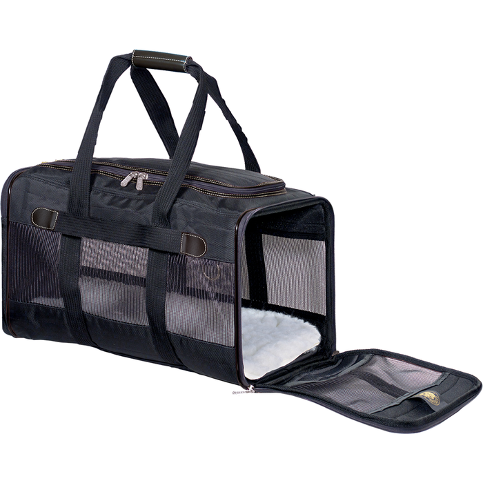 Travel in comfort and style with Sherpa® Original Deluxe™ Carrier. Perfect for traveling by plane or car, for a trip or just to the vet. Patented spring wire frame allows the rear end of the carrier to be pushed down several inches to conform to under-seat requirements. The carrier has mesh panels for ventilation, locking zippers to prevent accidental escapes, and includes a Seat Belt security strap which doubles as a luggage strap. Top and side entry options make it much easier to comfortably load pets in the carrier. A large side zippered pocket can hold your important pet travel documents and anything else your pet may need. The no-slip shoulder strap is adjustable and features a padded support for comfort. A soft, cozy, removable, and machine-washable faux lambskin liner is included. Sherpa® replacement liners are also available and sold separately. Approved for use on most major airlines.